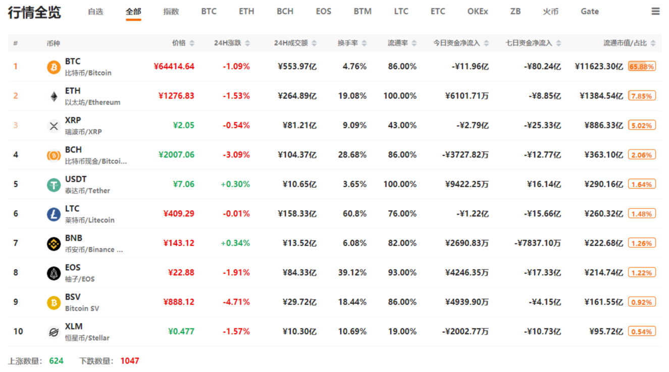 据QKL123数据统计,2019年11月04日13时,全球Token市场的总市值为17643.86亿元,24小时总市值增减-1.16%,总成交额为4986.60亿元,总成交额变化-1.12%,市场活跃度略有下降。巴比特综合指数报12607.58点,24小时涨跌为-1.42%,反映大盘有所回落;比特币强弱指数报97.95点,24小时涨跌+0.09%,比特币在整个市场的相对表现略有变强;Alternative情绪指数为56,与昨日(56)持平,市场情绪表现略显贪婪。
