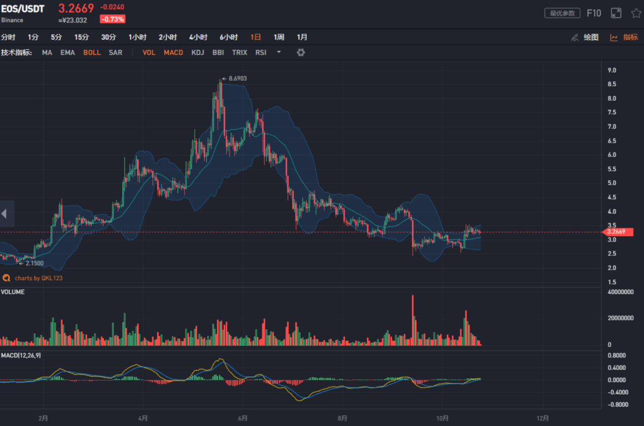 近日EOS横盘缩量震荡,短时表现相对弱势,变盘的可能性较大。
