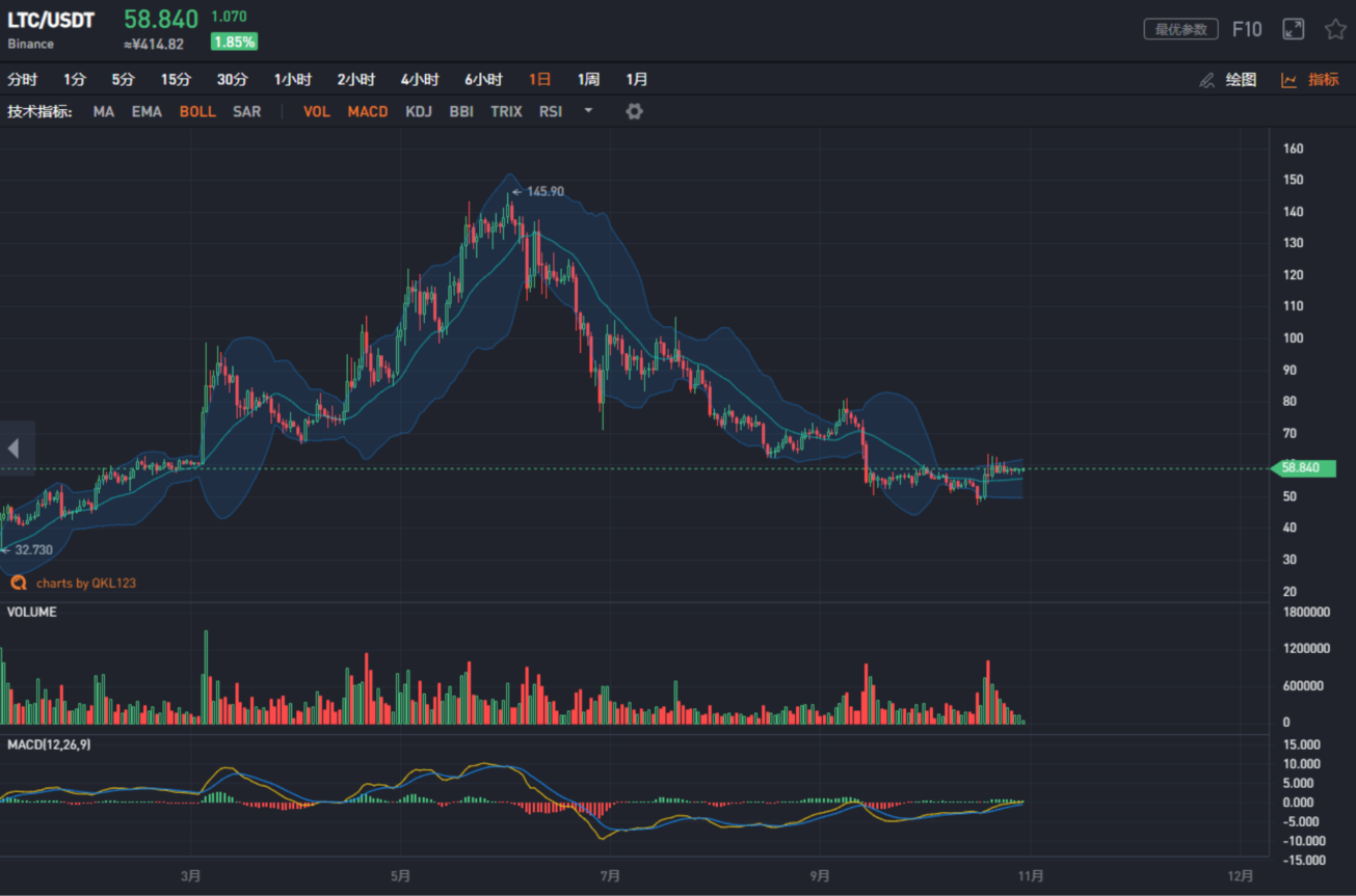 近日LTC缩量震荡,目前58美元附近,短时表现略显强势。