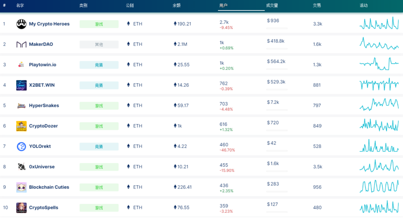 观察DappRadar统计数据,24小时ETH DApp整体活跃程度有所下降。游戏应用My Crypto Heroes的24小时活跃用户数2.7k,24小时变化-9.45%;金融应用MakerDAO的24小时活跃用户数1k,24小时变化+0.69%;竞猜应用Playtowin.io的24小时活跃用户数1k,24小时变化+0.20%。