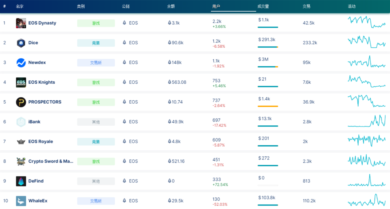 据DappRadar统计数据,24小时EOS DApp整体活跃程度有所回落,近日EOS网络资源拥堵所造成的影响比较明显。游戏EOS Dynasty的24小时用户数2.2k,较昨日变化+3.66%;竞猜应用Dice的24小时活跃用户数1.2k,较昨日变化-6.58%;交易应用Newdex的24小时活跃用户数1.1k,较昨日变化-1.92%。