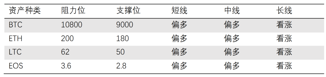 BTC长期趋势向好,目前大概率处于局部调整阶段,疯牛行情很可能在未来一至两年到来,加仓。智能合约平台龙头ETH、山寨币龙头LTC、DPoS龙头EOS的BTC相对价格接近年内低点,可适当配置。
